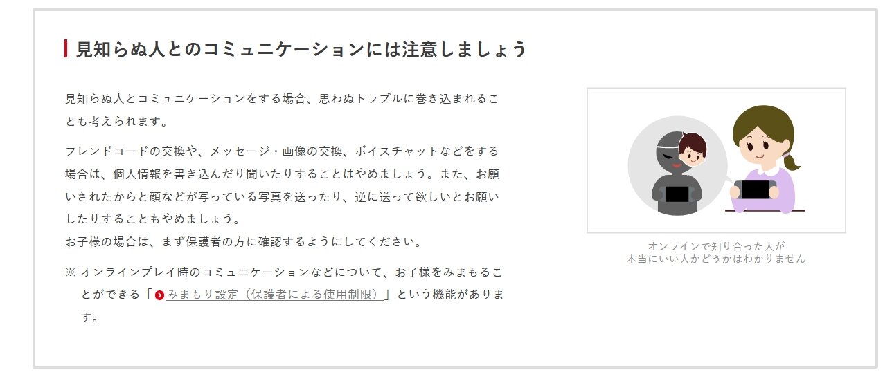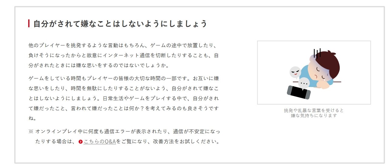 ・なお、言い返したりやり返したりすると、それ自体が利用規約違反となり、ご自身のニンテンドーアカウントや本体が利用停止になる可能性もありますのでご注意ください。