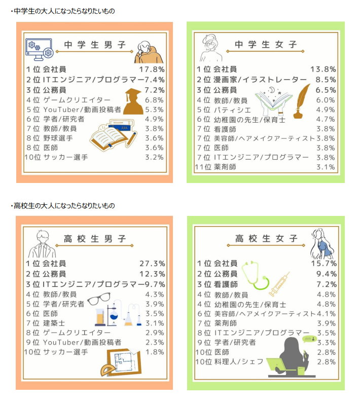 「大人になったらなりたいもの」中高生男女で「会社員」トップ コロナ禍から回復で旅行業人気も