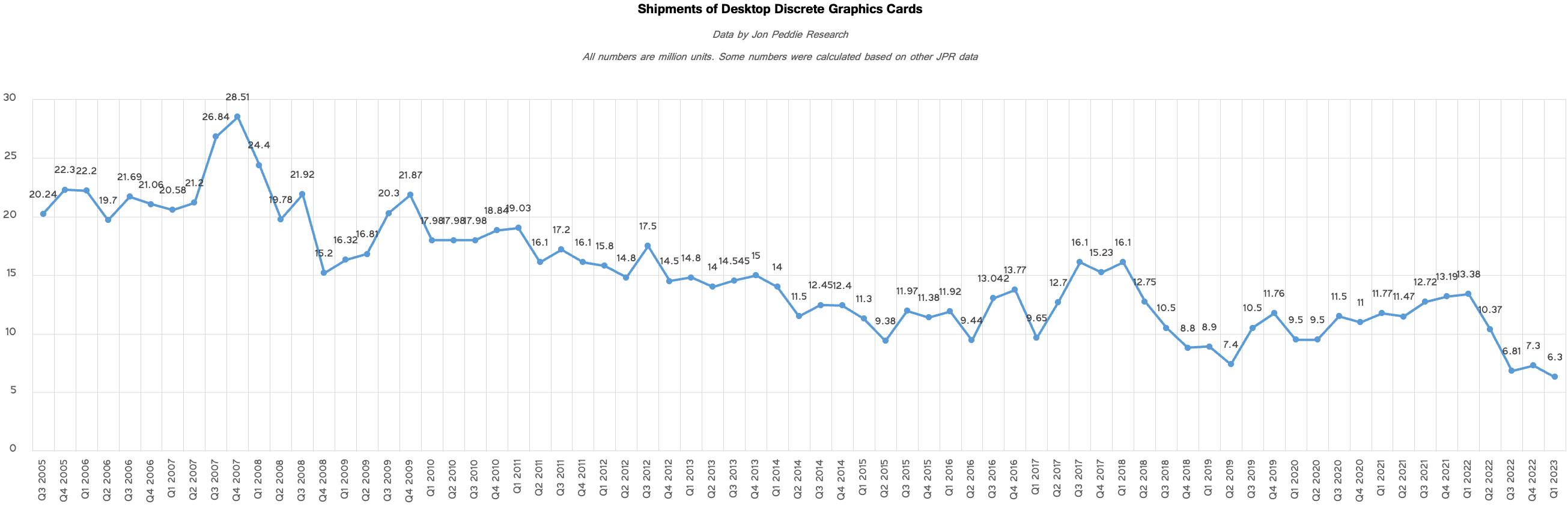 ・アナリスト会社Jon Peddie Researchが最新のグラフィックカード市場分析を公開したが、その結果はあまり芳しいものではなかった