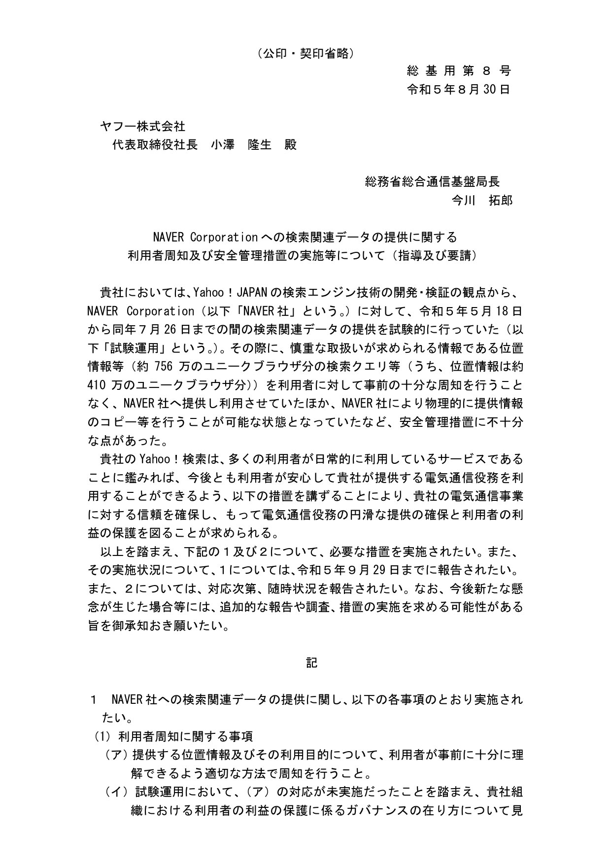 総務省では、本日、ヤフー社に対して、以下の事項の実施等を求めるとともに、その実施状況について報告を行うよう、文書(別紙)により行政指導を行いました。