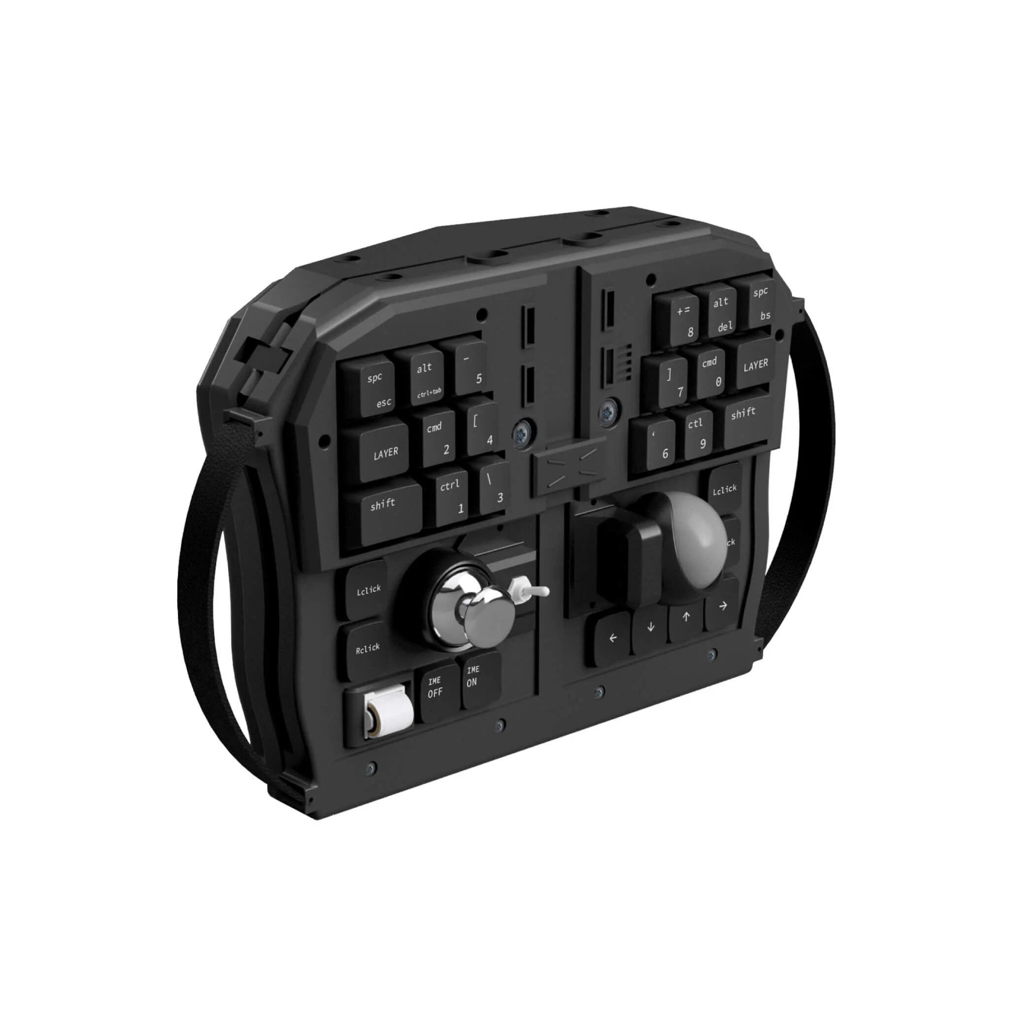 ・握って操作することを目的としたキーボードで、前面は親指操作でトラックボールマウスを操作したり、セットしたマクロボタンを押したりして操作。