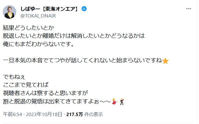 — 東海解放戦線団長 柴田ユウスケ (@TOKAI_ONAIR) October 18, 2023