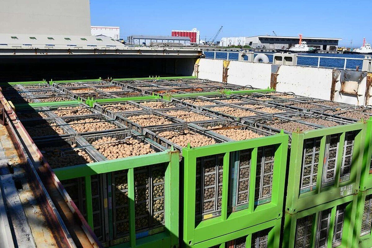 ・海上が荒れても荷崩れが起きないように専用のラックを使用。冷暖房と換気が出来る空調装置も備わっているため、輸送中でもジャガイモの保存温度が最適に管理できる優れものだ。