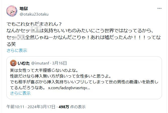 こういうのを鵜呑みにして女は全員性行為で気持ちよくなれないと思い込む人ができる