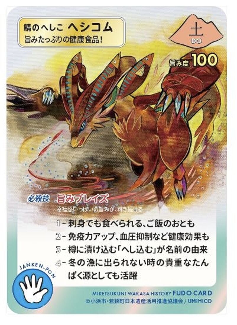 ・同団体は御食国(みけつくに)の食文化に親しんでもらおうと、キャラクターカード製作を2022年度に企画。熊川葛、福井梅、魚の「しょうゆ干し」などをモチーフに、7種のキャラクターが描かれたカード「御食国若狭歴史FUDOCARD(通称ミケフド)」を520枚ずつ製作した。今春から小浜市、若狭町の飲食店などで配布している。