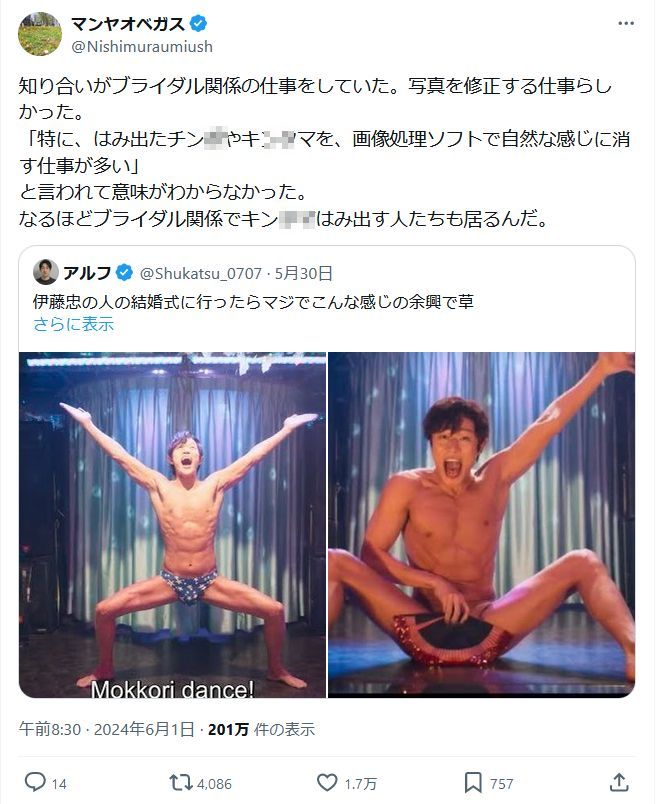 なるほどブライダル関係でキ◯タマはみ出す人たちも居るんだ。