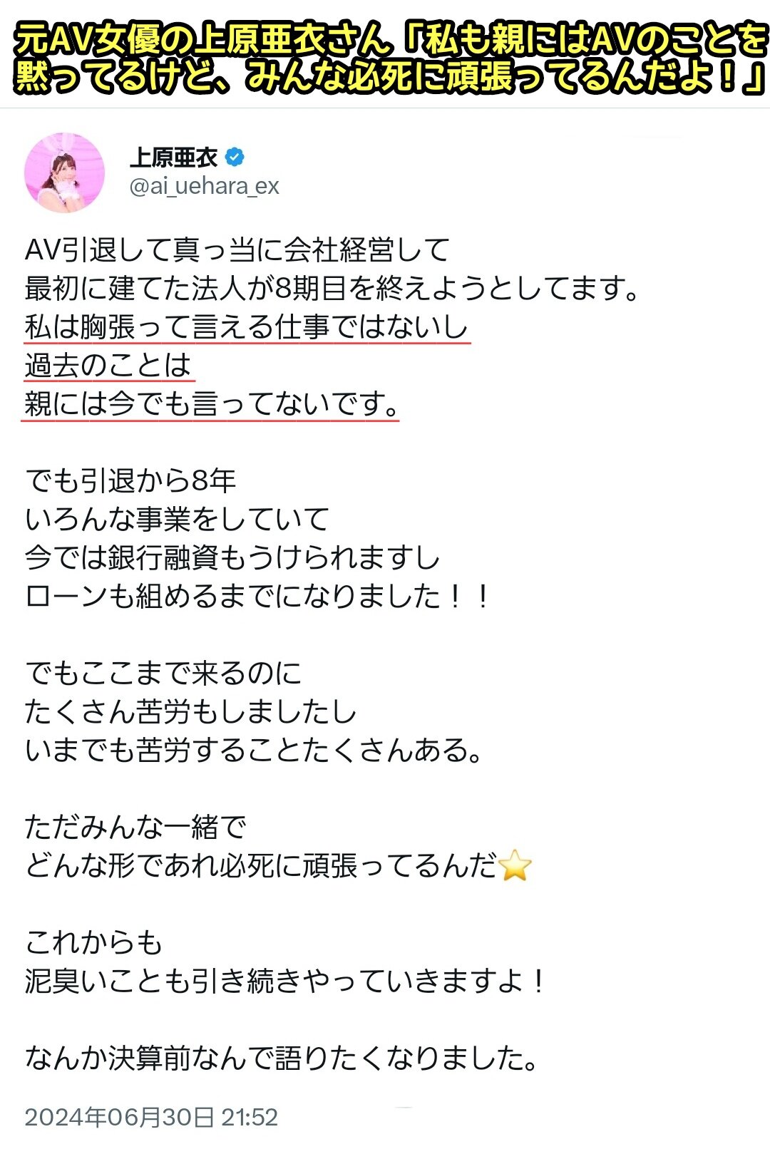 でもお仲間上原亜衣も「胸張って言える仕事ではない」や「親には言ってない」ような仕事だと思ってるみたいだね。