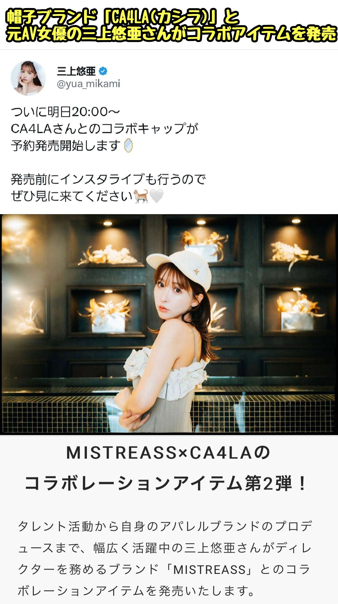 帽子ブランド“#CA4LA”が元AV女優の三上悠亜さんとコラボアイテム発売