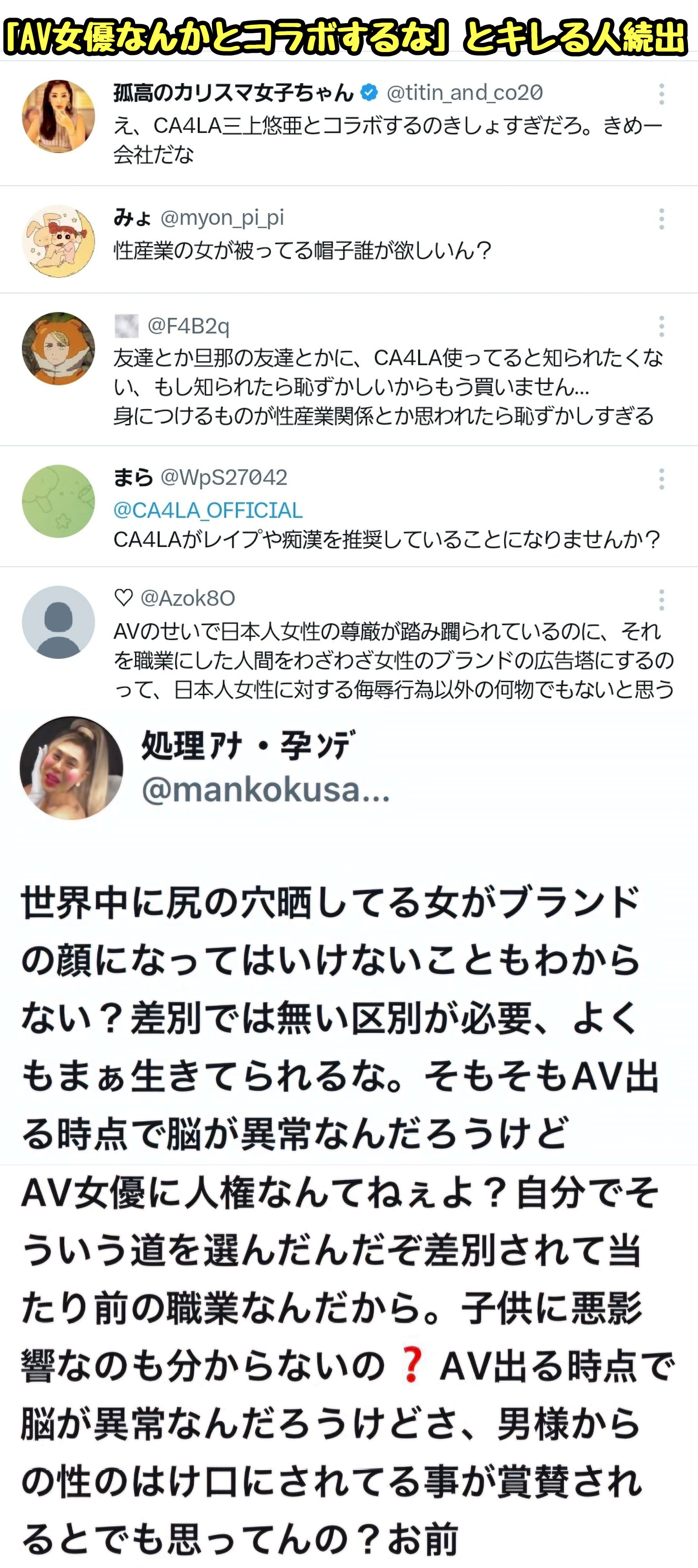実はそうでもないんですよ。というのも、CA4LAは過去にも三上悠亜さんとコラボしており、当時も炎上してるんですよね。なおコラボアイテム自体は即完売するほどの人気だったため、今回も「ブランド価値?売上があってナンボやろ」精神でコラボに踏み切ったものと思われますhttps://t.co/lQqiqvLgs6