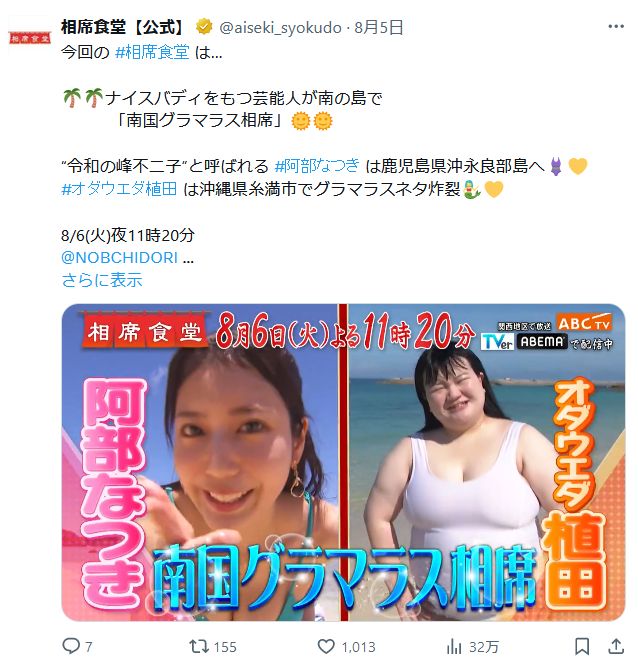 6日のABCテレビ「相席食堂」は「夏の南国グラマラス美女SP」を放送。オダウエダ植田紫帆の無双状態の大暴れに、ネット上で「相席食堂やばいw」「放送コードがよくわからなくなる回」「BPOが見てない事を祈る」との爆笑反応が相次ぎ、騒然となっている。