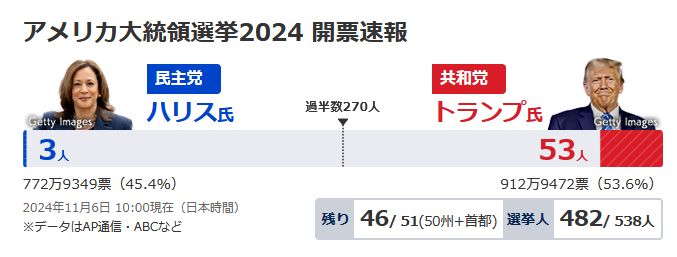 【速報中】アメリカ大統領選挙 開票始まる ハリス副大統領 トランプ前大統領 勝敗の行方は? | NHK