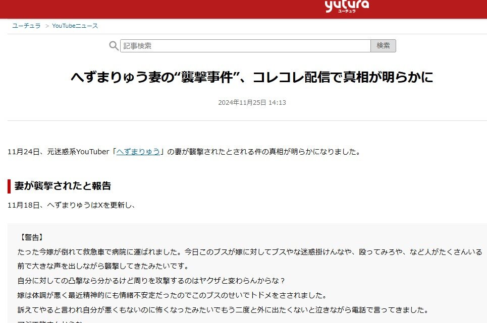 ・11月24日、元迷惑系YouTuber「へずまりゅう」の妻が襲撃されたとされる件の真相が明らかになりました。