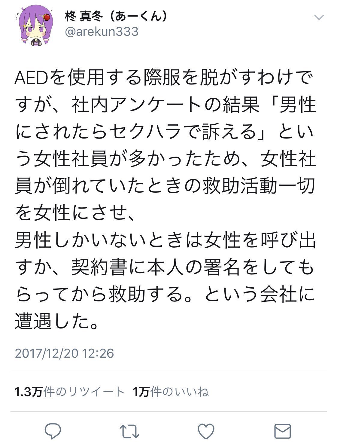 しかもこのアカウントは「女性が女性にAEDするのもダメ」と言ってて、完全に女性を殺しにかかってる pic.twitter.com/KpmONe3sac