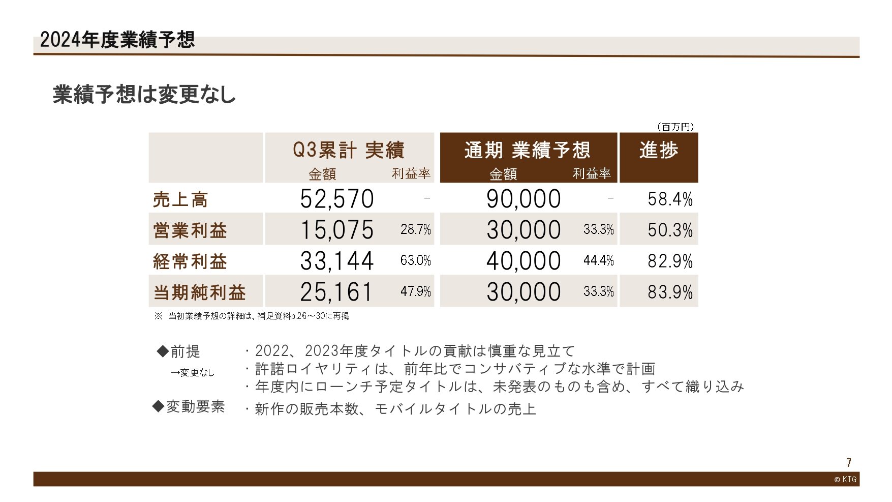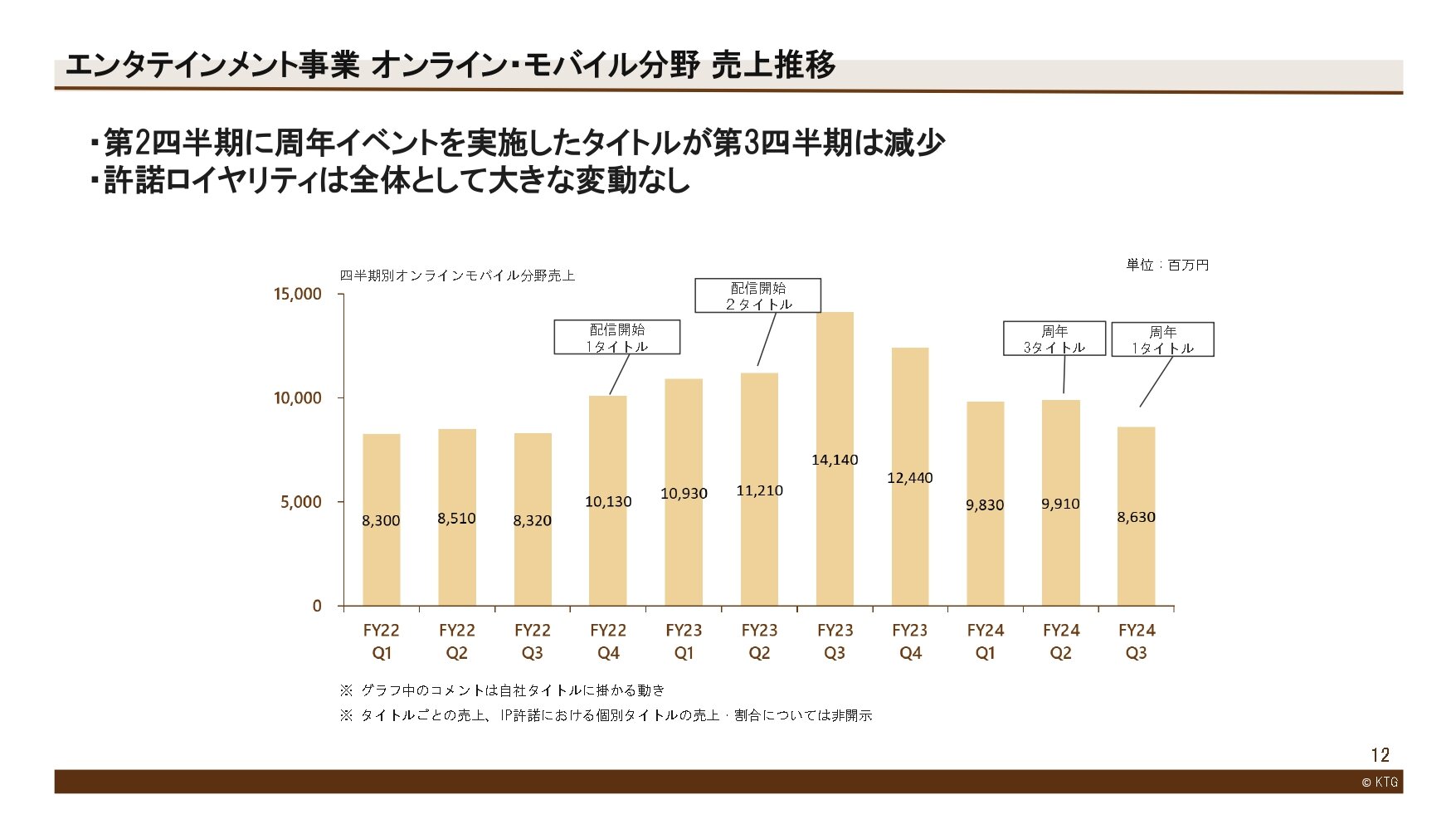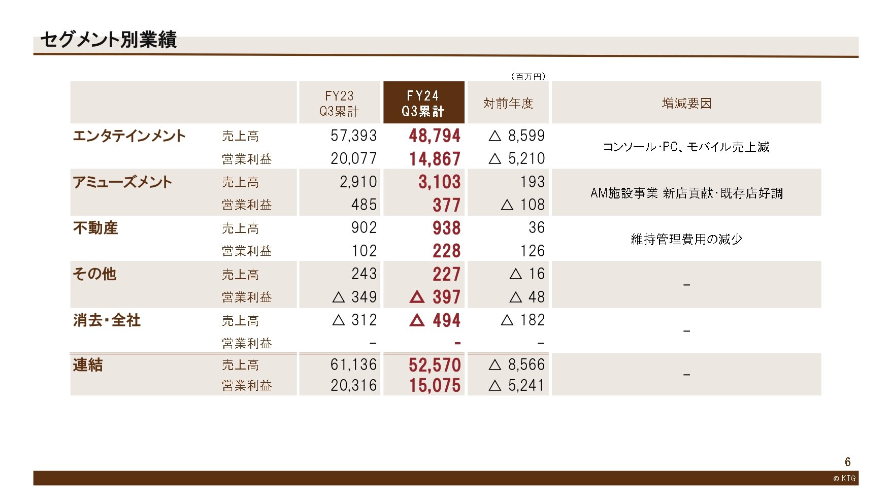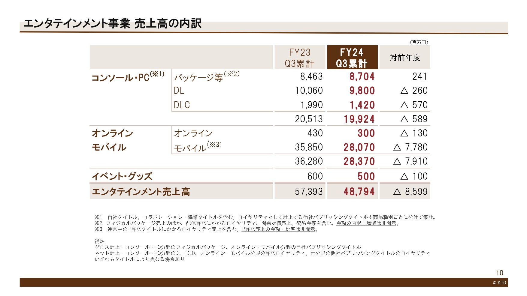 前年度は第3四半期までにパッケージ3タイトル、モバイル3タイトルの新作を発売しましたが、今年度は累計期間でパッケージ2本の新作の発売となり、既存タイトル中心の期間であったため、売上高、営業利益は前年度を下回りました。営業外収支は、市場環境も安定して推移する中、金融市場を注視しながら的確な運用を行ったことにより、第3四半期累計として過去最高となりました。