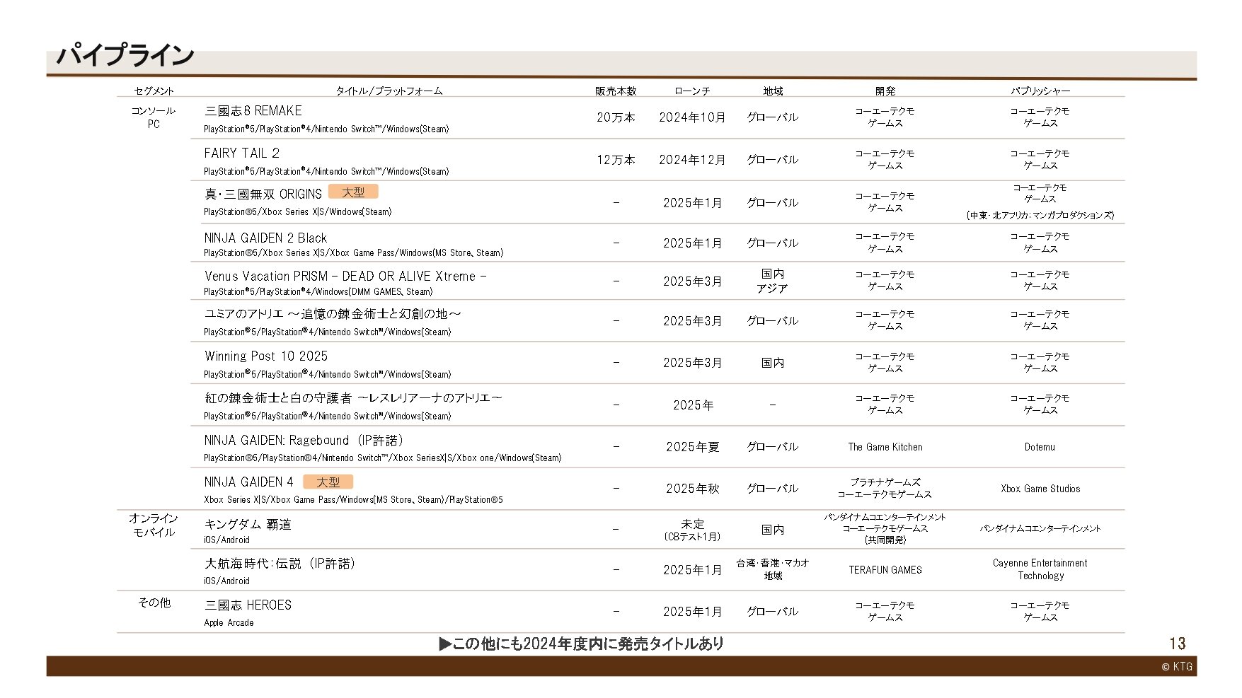 IP事業においては、当社がIPを許諾する『NINJA GAIDEN: Ragebound』(※2) (Nintendo Switch、PS5、PS4、Xbox Series X|S、Xbox One、Windows(Steam)用)の発売を2025年夏に予定しています。『三国志・戦略版』(国内では『三國志 真戦』)は引き続き収益に寄与しました。