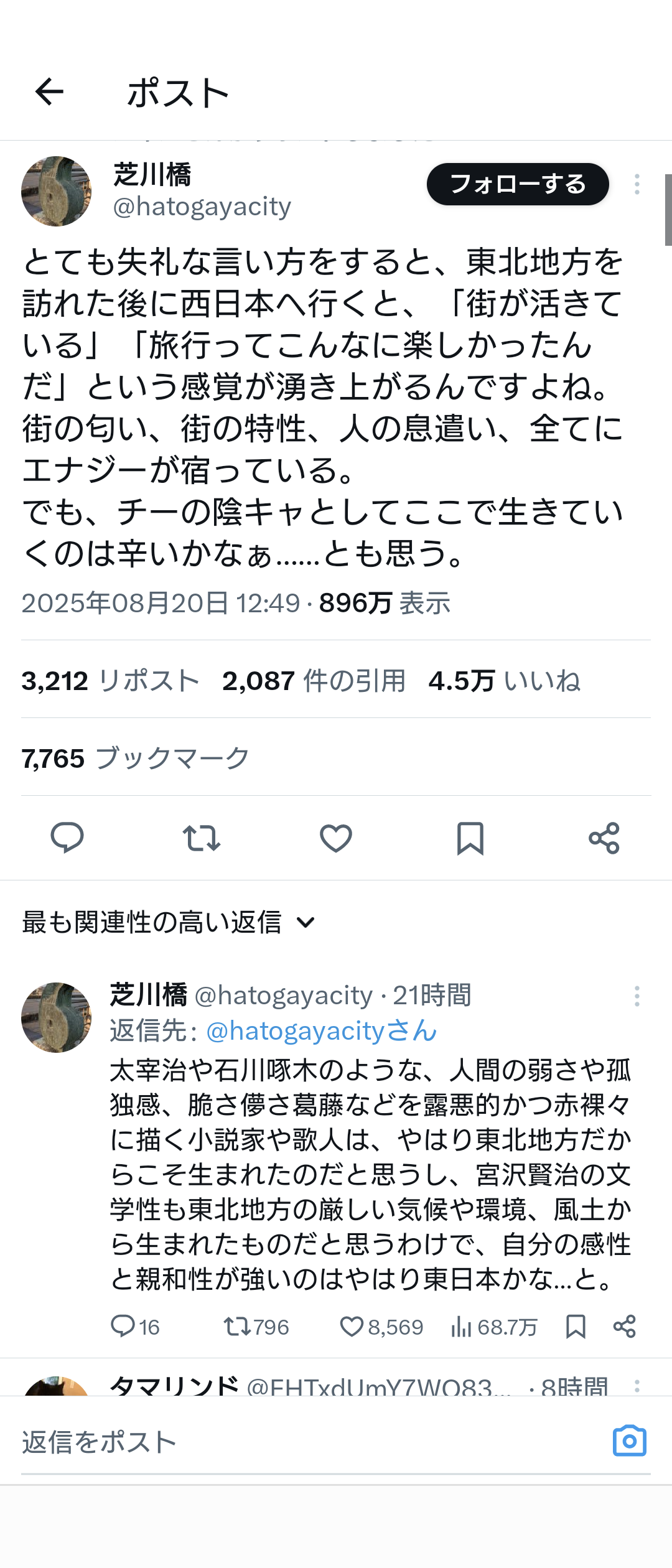 なんかオレのタイムラインで「東北は街が活きていない」「東北への旅行って楽しくない」としか読めない投稿が見せられたんだけど、なんなんやろねコレは。西日本サイコーとだけ言ってなさいよ。