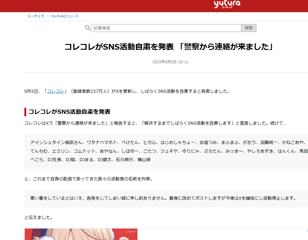 ・9月5日、「コレコレ」(登録者数237万人)がXを更新し、しばらくSNS活動を自粛すると発表しました。
