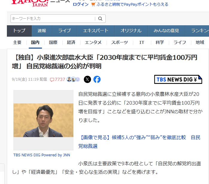 【独自】小泉進次郎農水大臣「2030年度までに平均賃金100万円増」 自民党総裁選の公約が判明