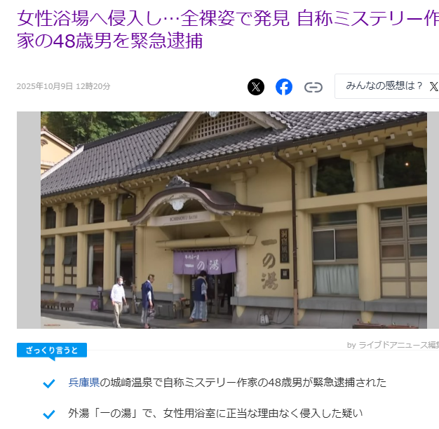 女性浴場へ侵入し…全裸姿で発見 自称ミステリー作家の48歳男を緊急逮捕