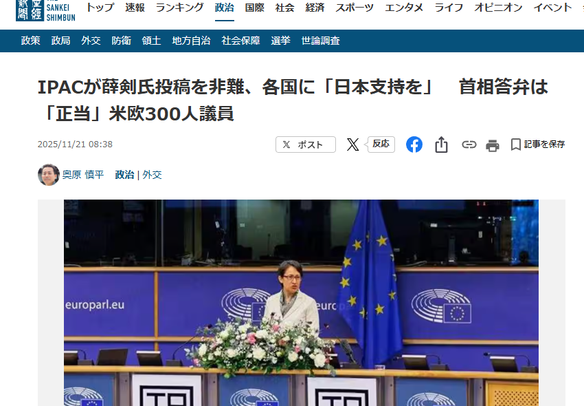 IPACが薛剣氏投稿を非難、各国に「日本支持を」 首相答弁は「正当」米欧300人議員