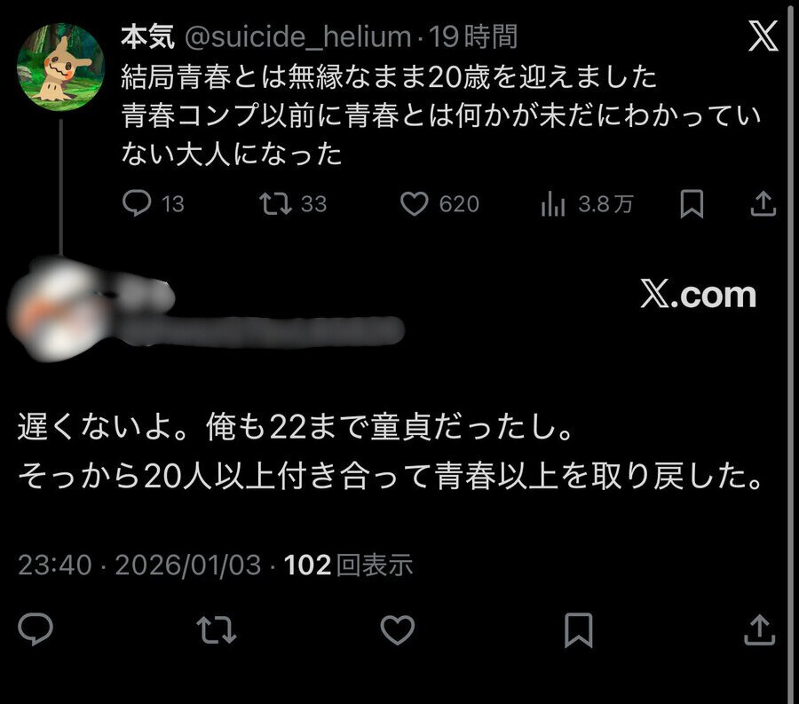 この人に悪意は無さそうだから引用リツイートは避けるけど、確実に青春を経験しなかった弊害出てるだろ