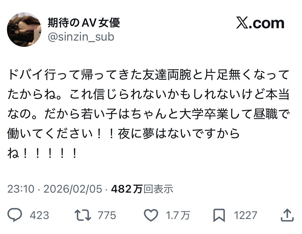 ドバイには行くなヤバいらしいから程度のバリューで話したかっただけやろ?