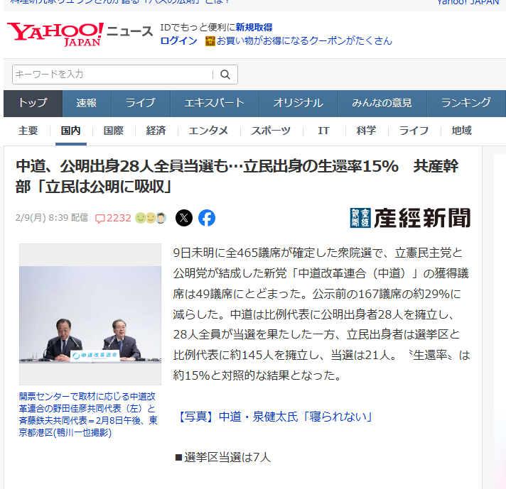 ・9日未明に全465議席が確定した衆院選で、立憲民主党と公明党が結成した新党「中道改革連合(中道)」の獲得議席は49議席にとどまった。公示前の167議席の約29%に減らした。中道は比例代表に公明出身者28人を擁立し、28人全員が当選を果たした一方、立民出身者は選挙区と比例代表に約145人を擁立し、当選は21人。〝生還率〟は約15%と対照的な結果となった。
