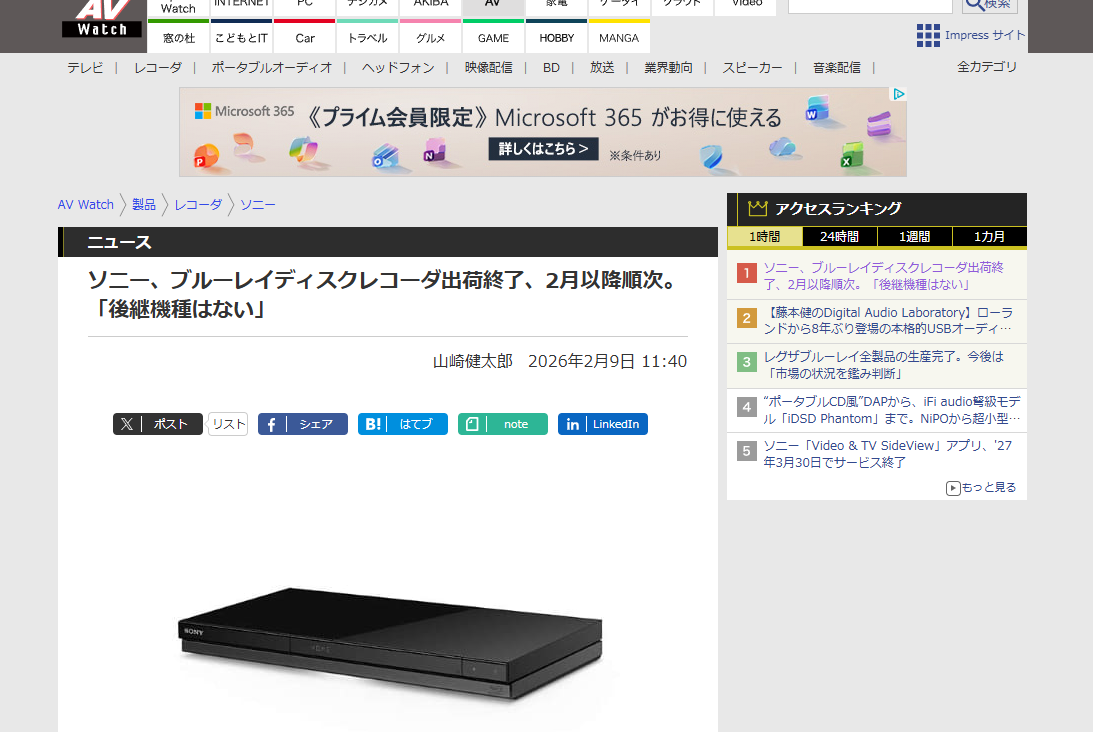 ・ソニーは9日、2026年2月以降順次、Blu-rayレコーダー全モデルの出荷を終了すると発表。「後継機種はない」という。ソニーは「これまで多くのお客様にご愛用いただきましたこと、厚く御礼申し上げます」とコメントしている。