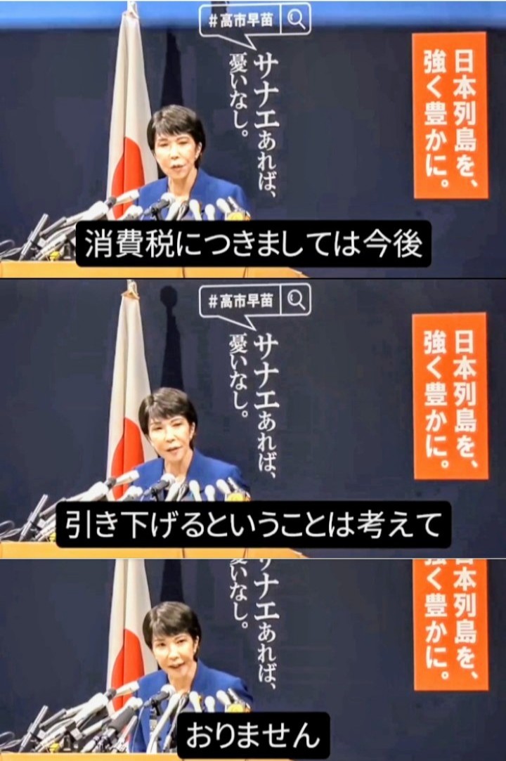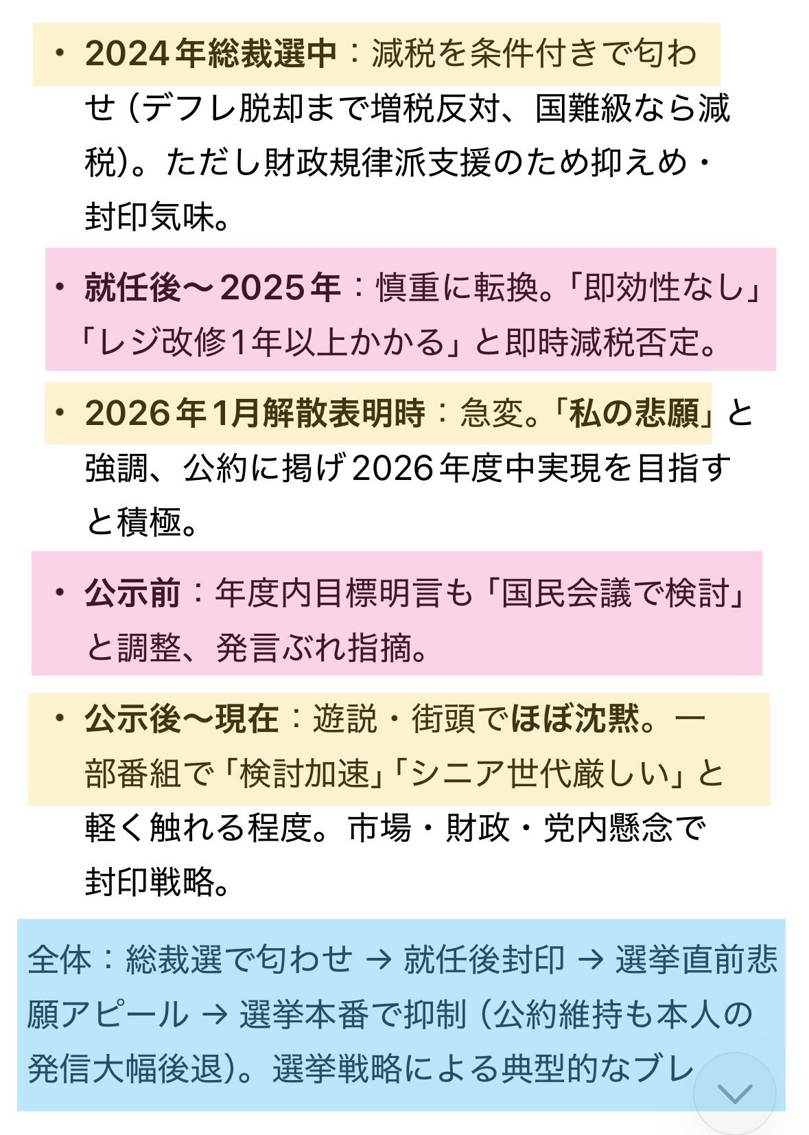 日経新聞が報じている通り、2025年5月には「国の品格として食料品の消費税率は0%にするべき」、9月(総裁選中)には「党内の意見集約ができなかった」、10月4日には「すぐに対応できることをまずは優先したい」、11月には「レジシステムの改修などに一定の期間がかかる」など、曖昧な態度に終始している。