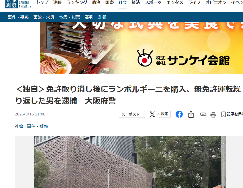 <独自>免許取り消し後にランボルギーニを購入、無免許運転繰り返した男を逮捕 大阪府警