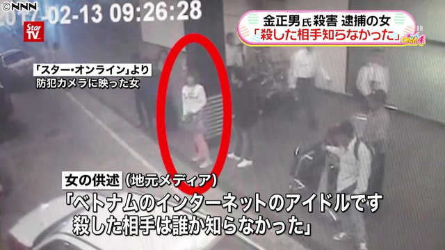 - 金正男氏がマレーシアの空港で殺害された事件で、実行犯とみられる女1人が逮捕された。女は「殺した相手は、誰か知らなかった」と話しているという。