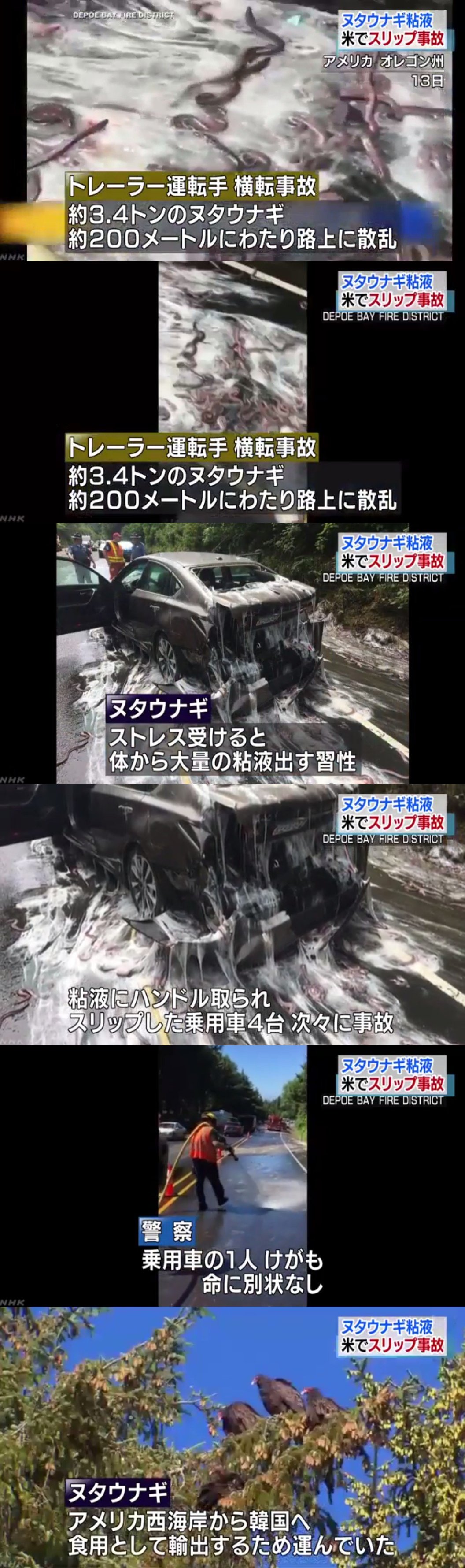 ・アメリカ西部の高速道路で、事故で横転したトレーラーの荷台から大量のヌタウナギが放り出されて路上に散乱