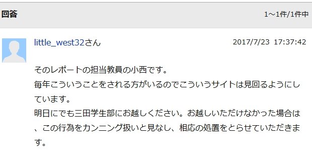 明日にでも三田学生部にお越しください。お越しいただけなかった場合は、この行為をカンニング扱いと見なし、相応の処置をとらせていただきます。