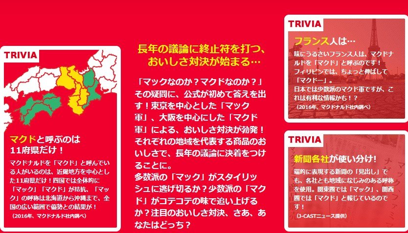 「マックなのか?マクドなのか?」公式史上初のマクドナルドの正式な“愛称”をかけたおいしさ対決!「マック軍」による東京をイメージしたスタイリッシュなバーガーか「マクド軍」による大阪をイメージしたコテコテのバーガーか。あなたのマクドナルドの呼び方に影響を与えるかもしれない、おいしさ対決。さあ、あなたはどっち?