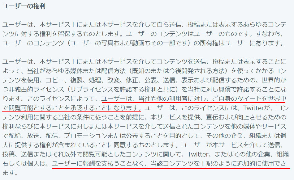 ユーザーは、本サービス上にまたは本サービスを介してコンテンツを送信、投稿または表示することによって、当社があらゆる媒体または配信方法(既知のまたは今後開発される方法)を使ってかかるコンテンツを使用、コピー、複製、処理、改変、修正、公表、送信、表示および配信するための、世界的かつ非独占的ライセンス(サブライセンスを許諾する権利と共に)を当社に対し無償で許諾することになります。このライセンスによって、ユーザーは、当社や他の利用者に対し、ご自身のツイートを世界中で閲覧可能とすることを承認することになります。