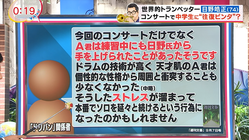 ジャズトランペット奏者の日野皓正(てるまさ)氏が今月20日、東京都世田谷区で開かれたコンサートで、壇上でドラムを演奏していた男子中学生の髪をつかみ、顔に往復ビンタを加えていたことがわかった。生徒にけ…