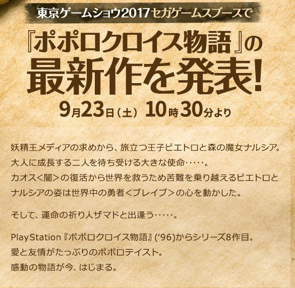 ・セガゲームスは、iOS/Android向けアプリ「ポポロクロイス物語 ~ナルシアの涙と妖精の笛」を、東京ゲームショウ2017内で9月23日に開催するセガブースのステージにて制作発表することを明らかにした。