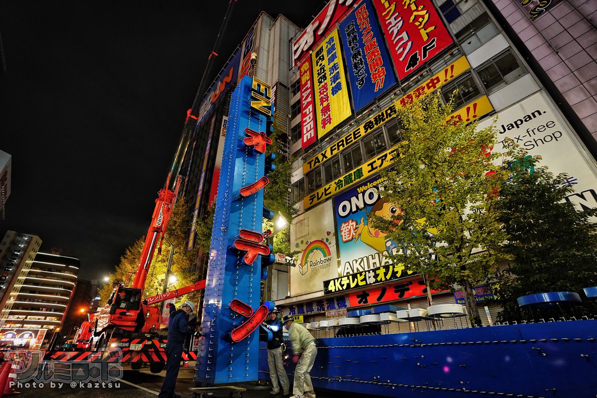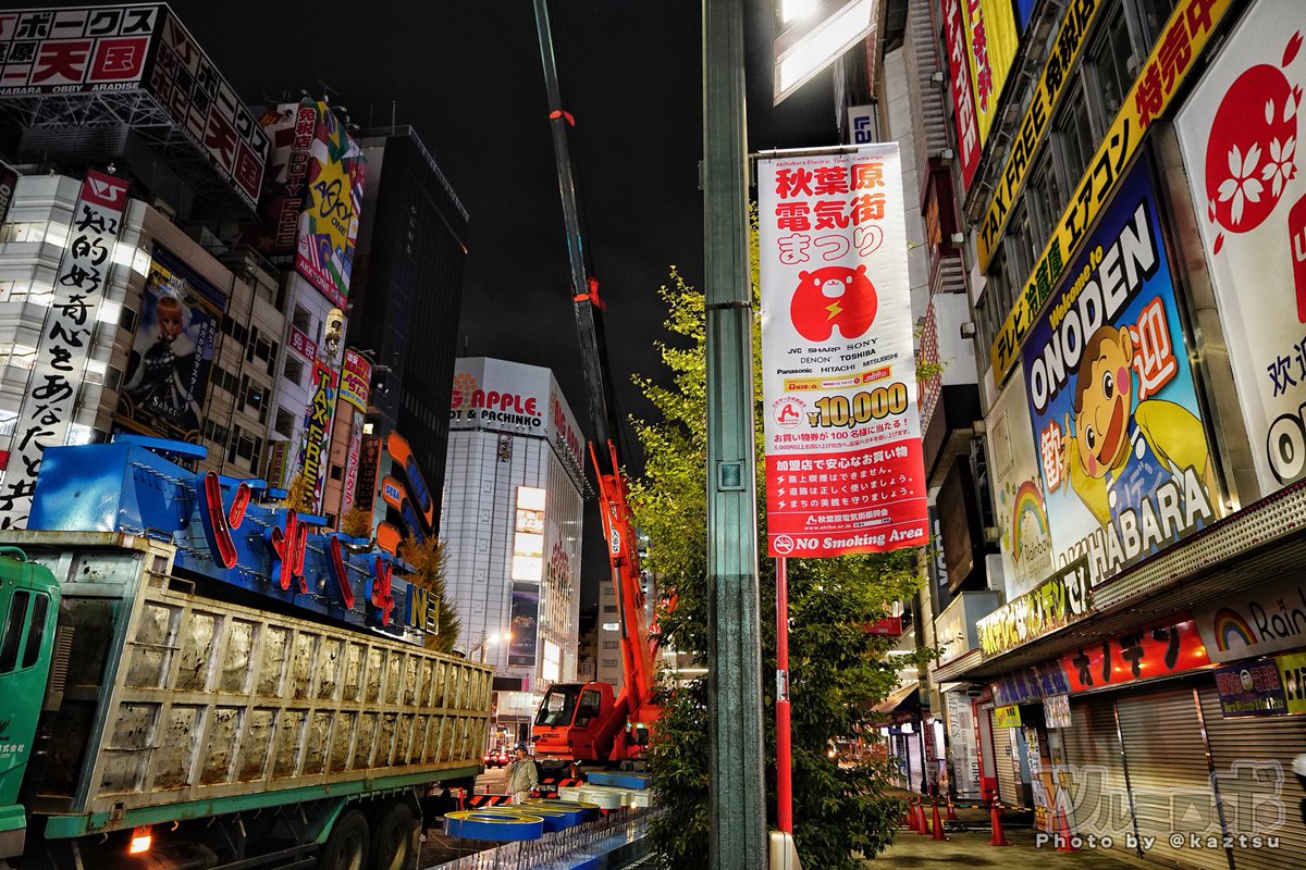 秋葉原に残る電気街らしさのネオン看板=オノデンの看板が撤去。鉄の塊で重さなんと2tだそう。冗談だとおもうけど、お店が免税店みたくなっちゃったから看板いらないんだって。鉄くずとして溶かされる運命らしい pic.twitter.com/Jj92BhrsAf