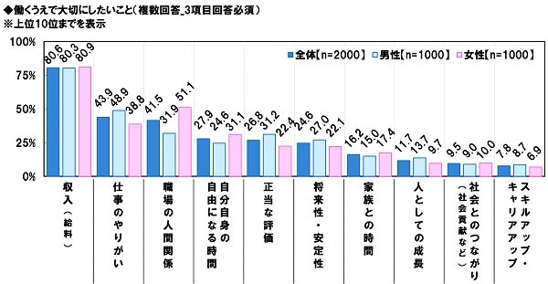 ・働くうえで大切にしたいことを聞くと、男女ともに1位は「収入」(男性80.3%、女性80.9%)。2位は、男性では「仕事のやりがい」(48.9%)、女性では「職場の人間関係」(51.1%)だった。
