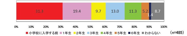 小学校入学前からパソコンを利用しているケースが最も高く、31.3%。また小学1 年生までで利用する人が全体の半数以上(50.7%)を占めています。