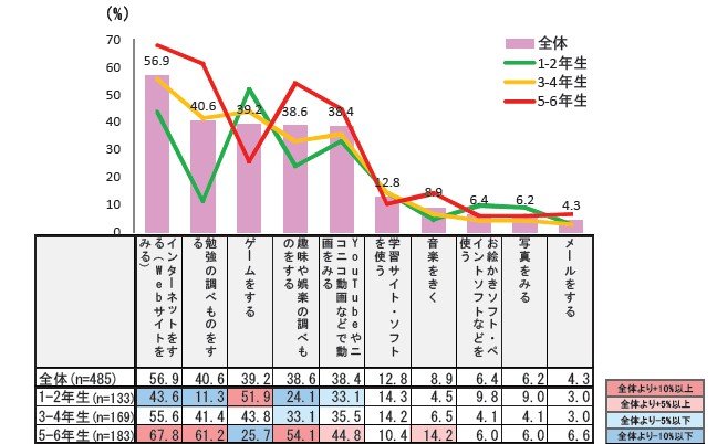 利用内容の上位10位をみてみると、インターネットのほかに、ゲームや動画視聴が上位を占めています。ゲームは1-2年生で利用が高いのに対し、勉強や趣味娯楽の調べ物、動画視聴は5-6年生で高くなっています。