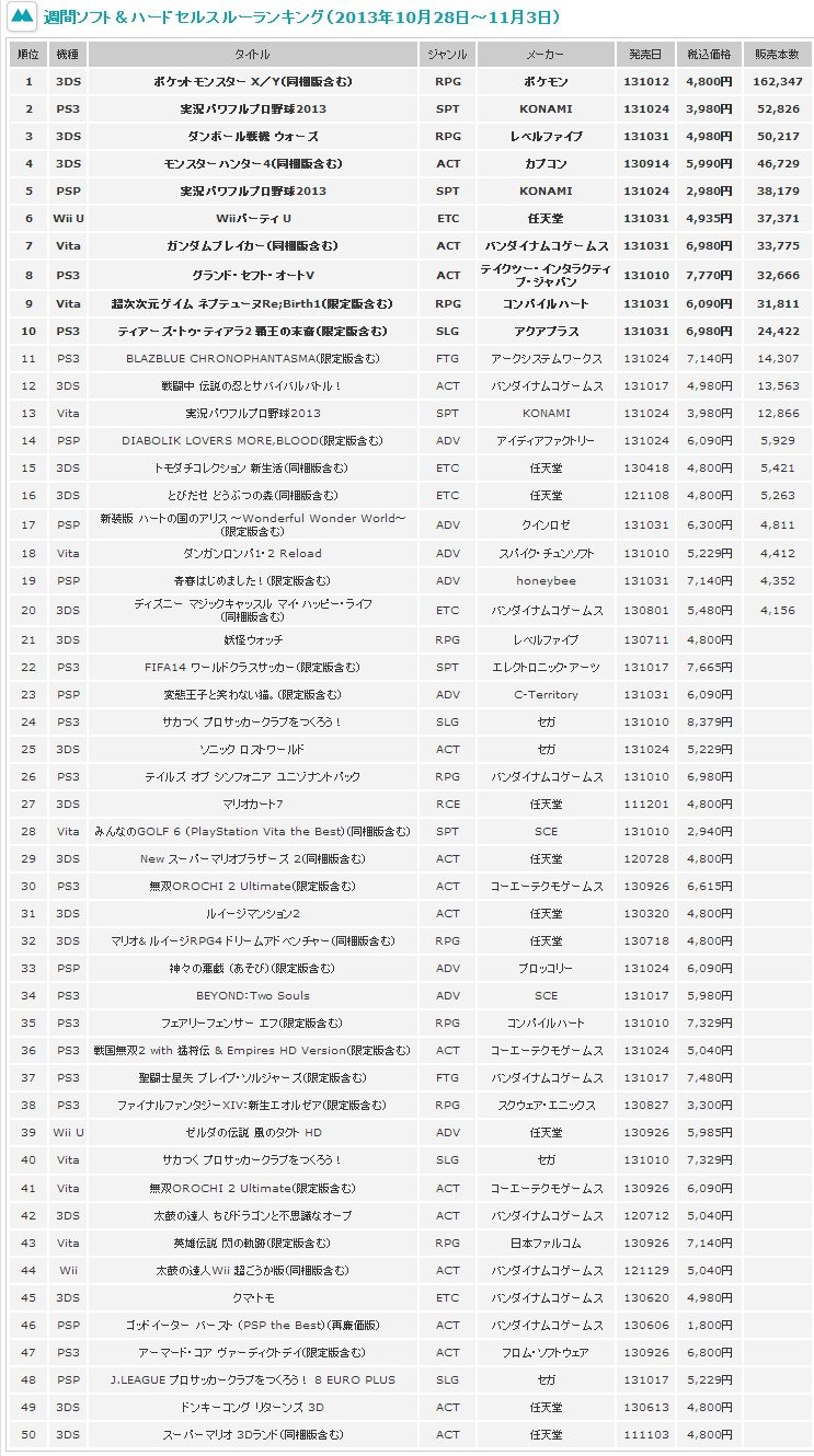 週間ソフト&ハードセルスルーランキング(2013年10月28日~11月3日) 目立った新作が不在となる中で、準新作が堅調さを見せる