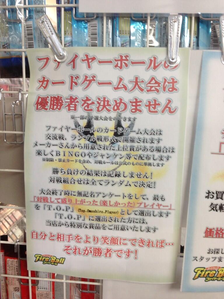 昨日のファイアーボールのまとめ ・参加費300円。ただし、バッヂ持ちは200円。300円払うと200円の商品券くれる。 ・大会の当たり方はランダム。勝ちと勝ち、負けと負けが当たるわけではない。 ・記録用紙に勝敗を書く欄はない(!?) ・対戦相手の名前だけ書く