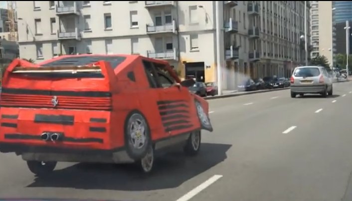 フェラーリといえば、誰もが知るイタリアの高級スポーツカー。普通の人はなかなか買えない存在だからこそ、憧れを抱く多くの熱烈なファンが世界にいるのだが、フランスではそんなファンなら笑ってしまいそうな、力技過ぎる“フェラーリ”を自作して街中を走らせたアーティストがいる。その様子を紹介した動画を一部欧米メディアが紹介し、ちょっとした注目を集めているようだ。