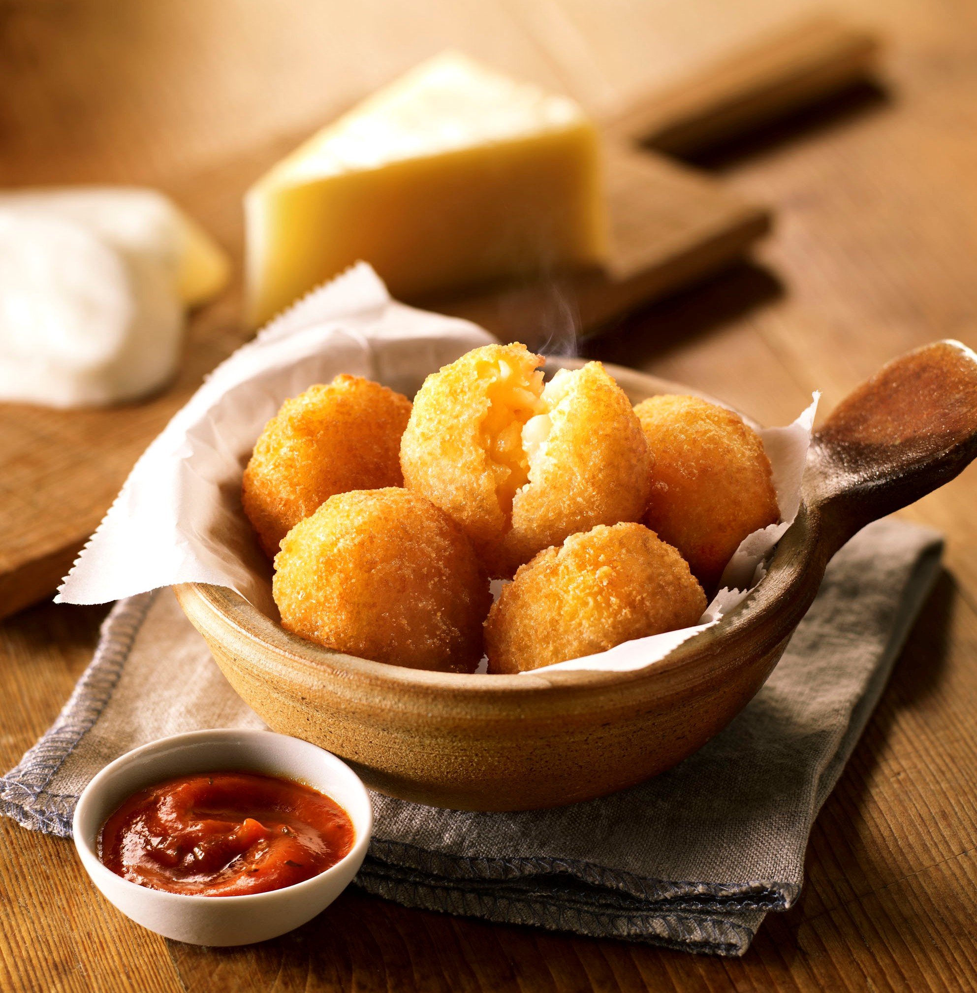 「チーズポテトディップ」は、チェダーチーズとモッツァレラチーズの2種類のチーズと刻んだポテトを混ぜたフライを、相性抜群のアラビアータソースにディップして食べる新メニュー。