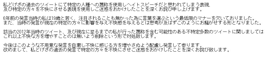 私が過去に行ったツイートにより、特定の方々にご迷惑及びお騒がせしてしまったことをお詫び致します。