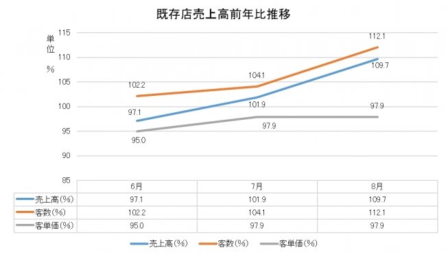 8月1日から実施した「営業時間変更」が大きく影響しています。土曜・日曜の開店時間を早め、閉店時間を短縮し、平日の閉店時間を短縮しました。土日の昼食利用と昼飲み需要増と深夜飲みの需要減に合わせ、営業時間を切り替えたことが、客数増と売上増に繋がったと考えます。