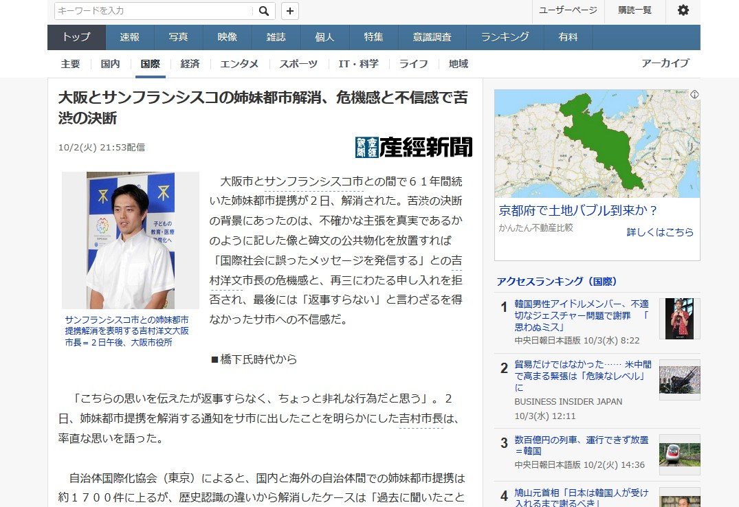 慰安婦問題の鎮静化が期待できない現状では、姉妹都市の解消はベストな選択だったと思う。