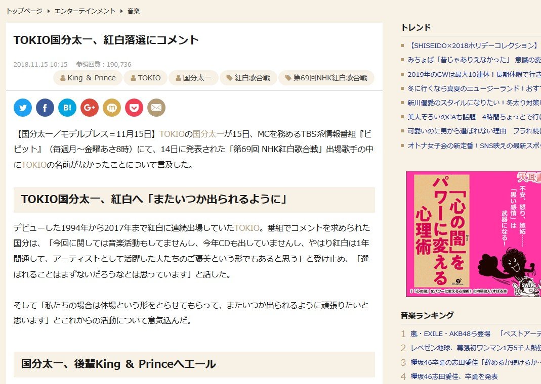 ・ TOKIOの国分太一が15日、MCを務めるTBS系情報番組『ビビット』(毎週月~金曜あさ8時)にて、14日に発表された「第69回 NHK紅白歌合戦」出場歌手の中にTOKIOの名前がなかったことについて言及した。