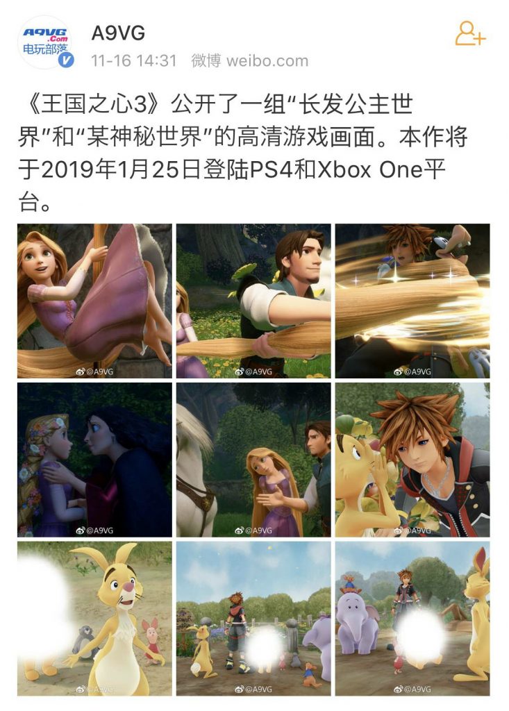 ・記事の見出しは「《王国之心3》公开了一组”长发公主世界”和”某神秘世界”的高清游戏画面。本作将于2019年1月25日登陆PS4和Xbox One平台。」というもの。